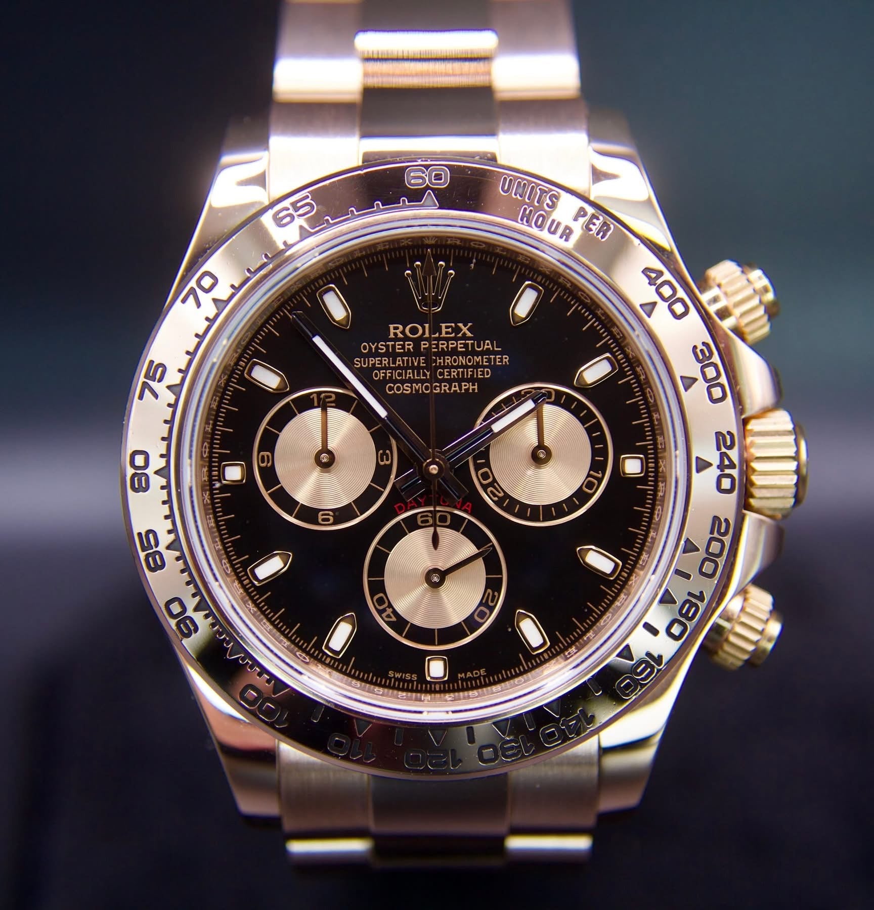 Experience the epitome of luxury with the Rolex Daytona, Reference Number 116505. Crafted in exquisite rose gold and featuring a striking black index dial, this pre-owned timepiece combines elegance and performance. Complete with original box and papers dated September 11, 2012, it's an exceptional find for any watch enthusiast.